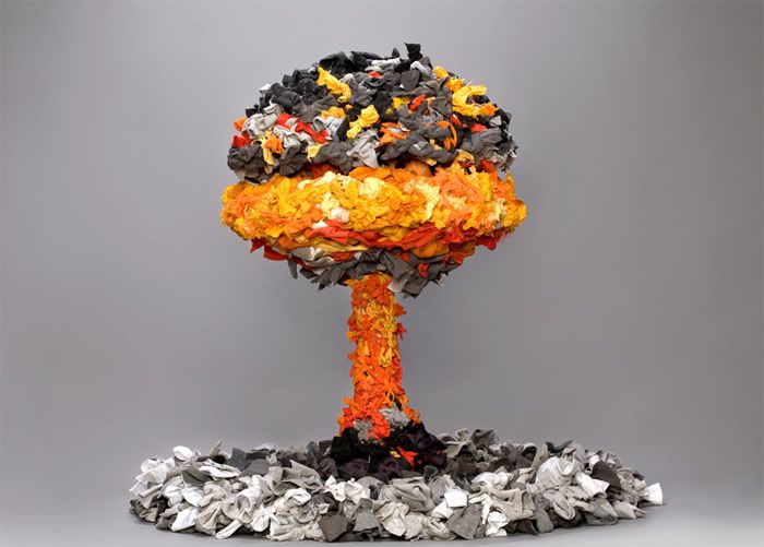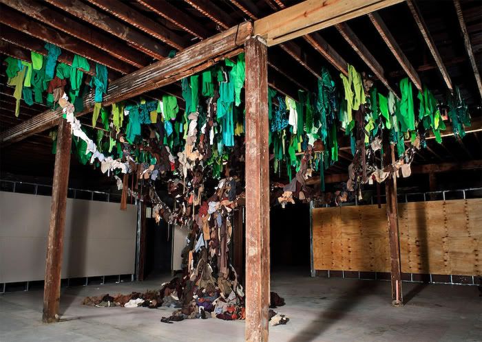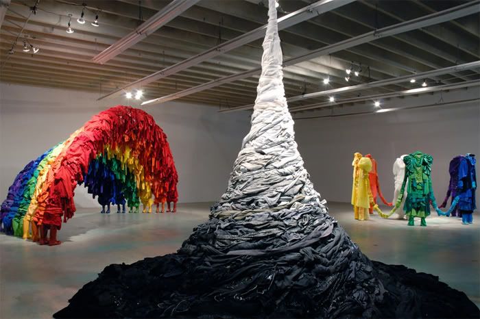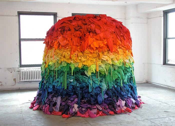 + the stunning art pieces you are looking at are actually old discarded clothes. they are the work of alain guerra and neraldo de la paz, a duo both born in cuba known as guerra de la paz. the sculptures are supposed to explore materialism in our contemporary society and meant to make us think about our “mass-produced refuse.” luckily the artists don't see these abandoned clothes as trash and are able to turn them into something artistic and expressive, whether it is a colorful rainbow or explosion cloud.