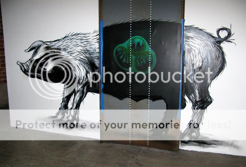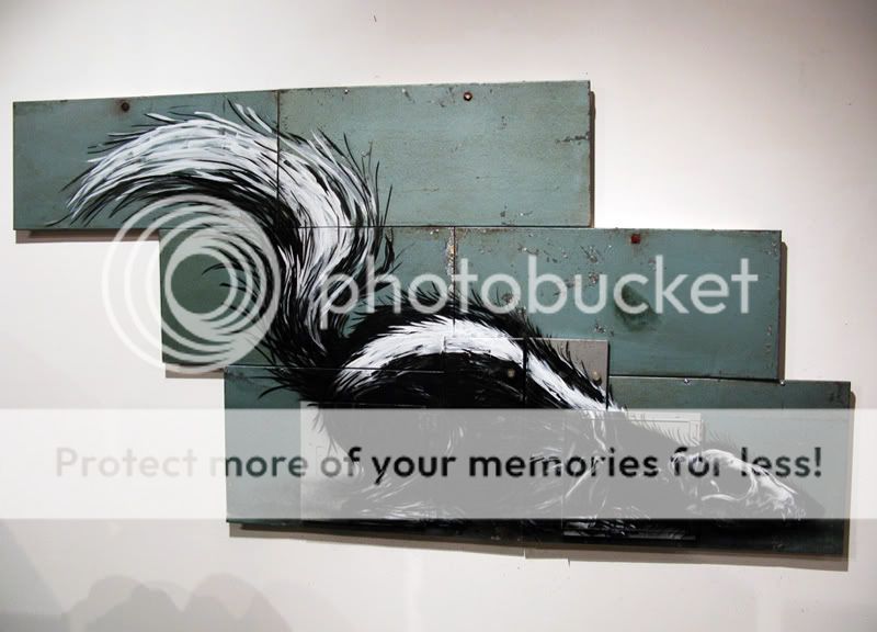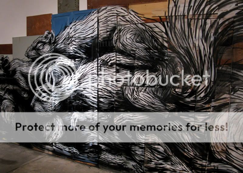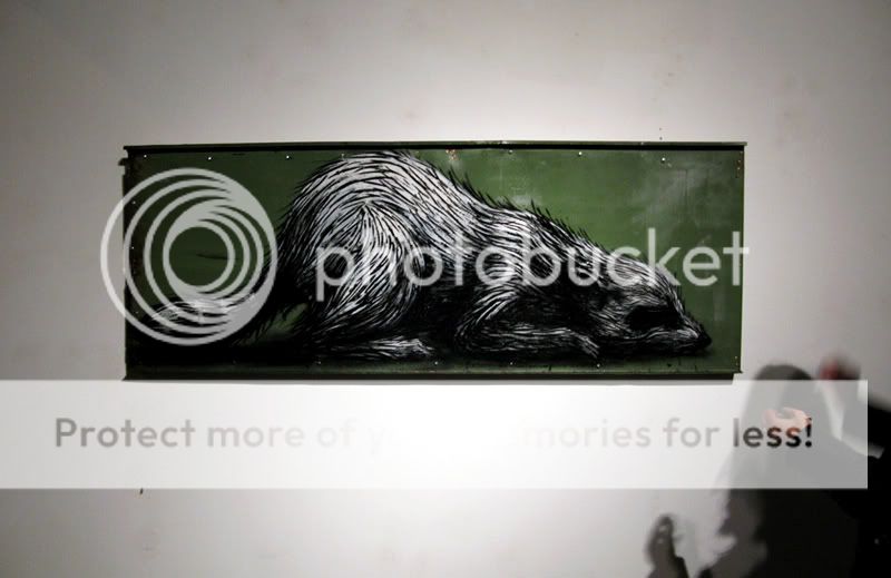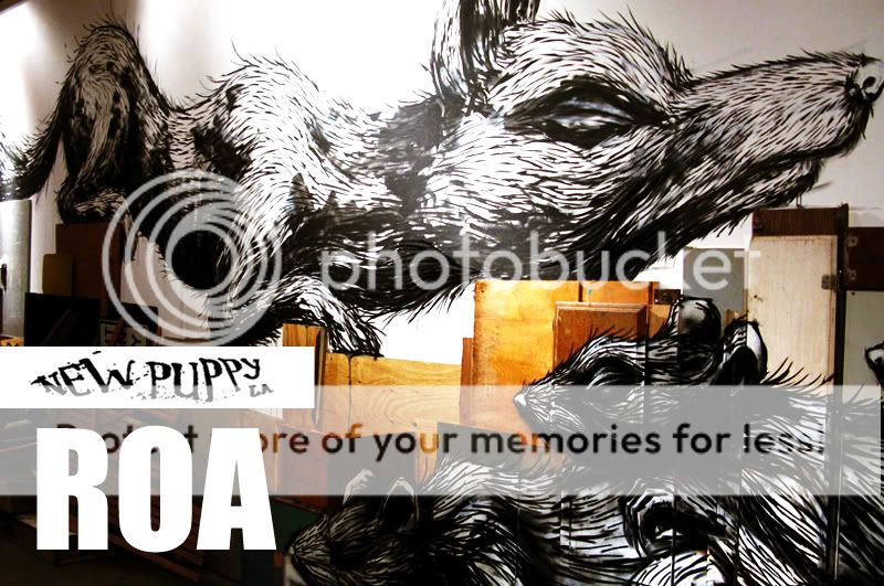 Presented by Thinkspace and showing at the New Puppy Gallery in Los Angeles till November 24, 2010, are special works by ROA. The pop-up gallery is set in a large warehouse where the main theme appears to be various animals and creatures drawn in various states of slumber or decay. Through his art (street and gallery) ROA is sending a "reminder towards city art lovers that there is indeed nature all around us, even in the middle of the City of Angels. His street work brings to mind the natural world before it was covered in skyscrapers and highways."